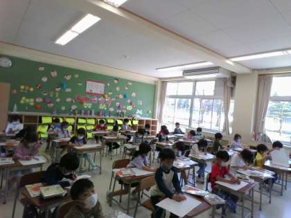 12日は図工で絵を書きました。自分の好きなものを紹介できるように、好きな物をたくさん並べました。「ぼくもそれ好き」「知ってるよ、これ」と話し合う姿は、とても楽しそうでした。