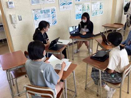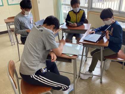 全校のみんなが常に意識できるスローガンになるように、1人1人が考えてきた案をクロムブックやノートを用いながらプレゼンテーションしていました。