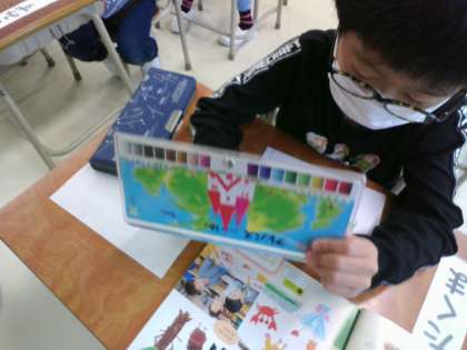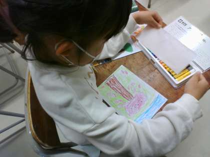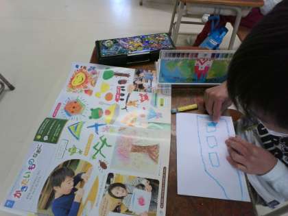 図工で、自分の顔や好きなものを画用紙に描きました。素敵な作品に仕上がりそうです。学習参観の際にご覧いただきたいと思います。