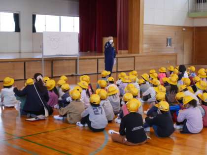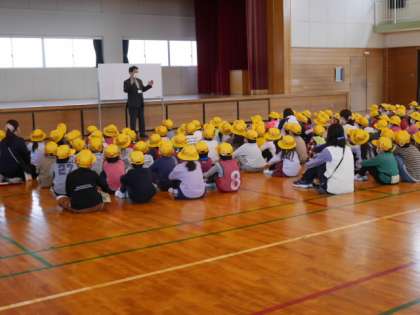 青空の下、交通安全教室を行いました。まずは校長先生や警察の方から正しい歩き方、安全確認の仕方などのお話を聞きました。目、耳、手、足の体全部をつかって確認することを教えていただき、いい姿勢で話聞く姿がすてきでした。
