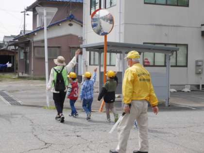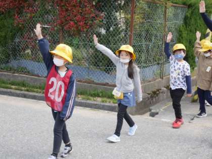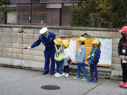 お話のあとは、実際に道路を歩いてみました。交通指導員の方と一緒に右左を確認して、手をぴんと挙げて歩くことができました。車もたくさん通りましたが、一人一人が安全に歩く大切さを感じて、真剣に取り組んでいました。下校する前も教えていただいたことを思い出して気を付けようとしていました。また、教えていただいたことをおうちでも話したいと子供たちは話していました。
