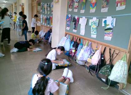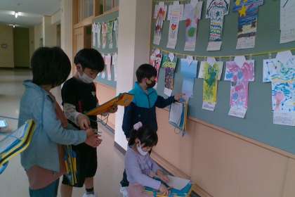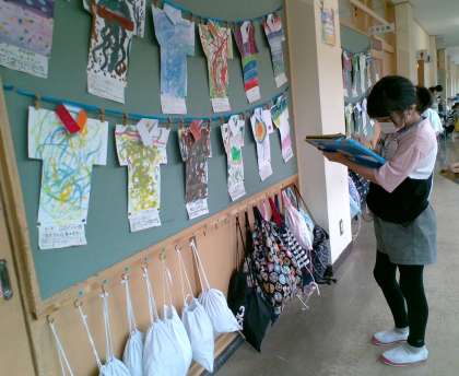 図画工作科「絵の具+水+ふで=いいかんじ」の学習で仕上がったTシャツを鑑賞しました。「この色どうやって作っているのだろう。」「筆の使い方がおもしろいな。」など、友達の作品の素敵なところを伝え合っていました。
