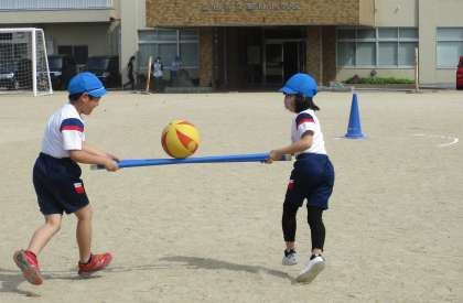 3年生は、運動会の団体種目でボール運びを行います。本番に向けて、ペアの相手とタイミングをそろえて、一生懸命練習に取り組んでいます。