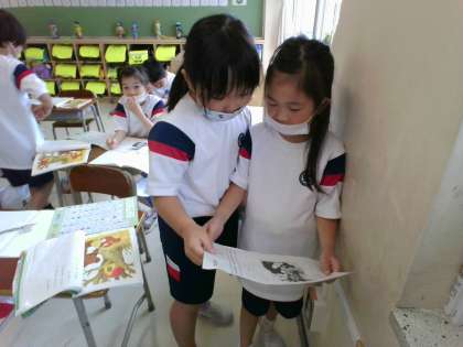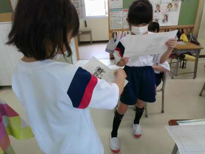 友達の書いたワークシートと自分のワークシートを交換しながら、「おもしろいね」「私のとちがうね」と楽しそうにお話していました。