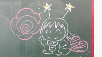 担任のかわりに教室にいてくださった先生が、黒板にこんな素敵な花丸を書いてくださいました。子供たちのがんばりをほめる花丸です。