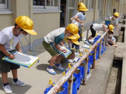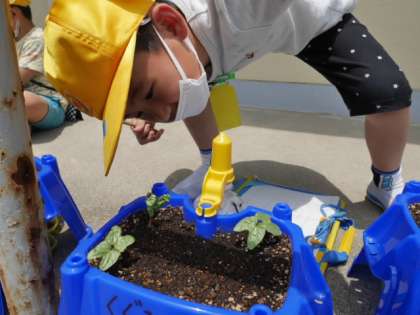 先週種を植えたアサガオの芽が出てきました。葉っぱが開いている、まだ種がついている等さまざまなことに気付いて観察しました。これからも大切にお世話をしていきます。