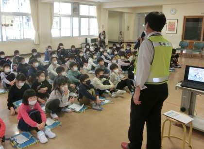 自転車教室を開催し、南警察署や下堀交番の方々、交通安全協会の皆様に来ていただきました。そして自転車に乗るときの注意点を分かりやすく教えていただきました。子供たちは、自分や周囲の人の命を守るために、安全に自転車に乗りたいと真剣に考えていました。