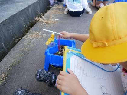 種を植えた鉢に芽が出てきました。子供たちは嬉しそうな様子で、定規や虫眼鏡を使って、色・形・大きさを詳しく観察していました。芽と呼んできたものは子葉と言い、植物によって形や大きさは異なるが、葉の枚数は同じことを学びました。