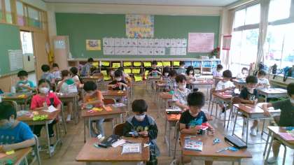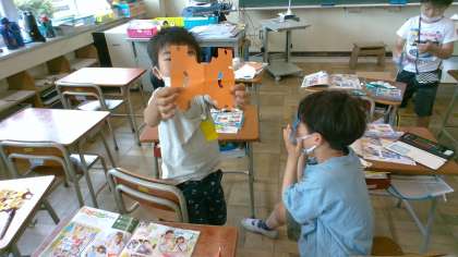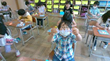 図工で折り紙を切って飾りをつくっています。何回も折った折り紙に切り込みを入れてきれいな模様をつくったり、つながったかざりをつくったりしました。なにができるか、開いてみてからのお楽しみなので、「こんな形になったよ〜」「ちゃんとつながった!」といろんな声が聞こえました。