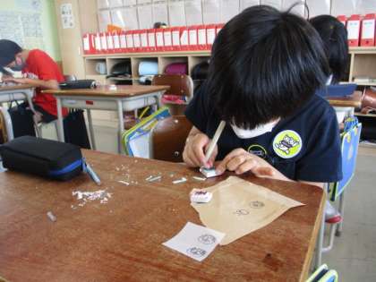 消しゴムはんこを作成しました。書写の時間に書く習字や図工の作品に押して活用する予定です。