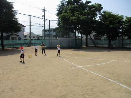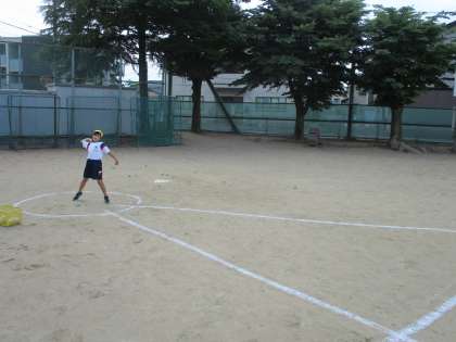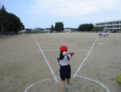 ソフトボール投げです。「遠くまでボールを飛ばすにはどうすればいいのかな」と聞くと「斜め上に投げたらいいよ」「腕を思いっきり振るよ」という意見がでてきました。自分の番が来ると考えたことを実践しており、1年生の時より遠くまで飛んでいきました。