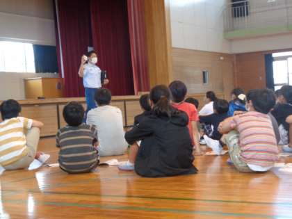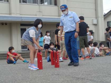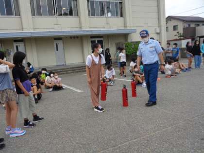また、後半は消火体験を行いました。消化器が意外と重たいことや狙う難しさがあることなど、体験を通して多くのことを学んでいました。