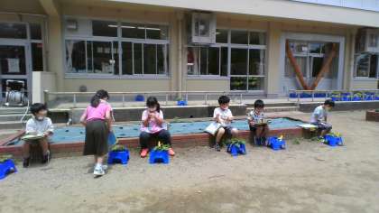 「最後の1つの芽が出たよ」「つるが伸びてきた」「葉っぱが大きくなってる」など、子供たちは観察のたびに、目を輝かせています。