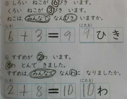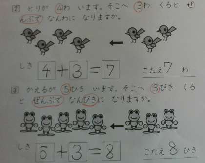 式に使う数字を「わかっている数」、演算決定をする言葉を「足し算言葉」、答えにつける助数詞を「答えスリッパ」などとして教えています。文章題を解くときには、それぞれ丸で囲むように指導しています。
