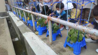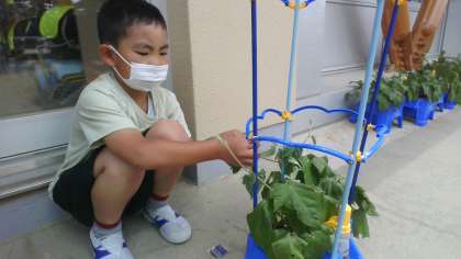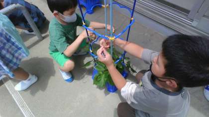 子供たちがお世話しているあさがおも成長し、つるがニョキニョキと伸びてきました。