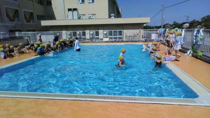 水慣れから、顔をプールに入れるところまで学習しました。晴天の中、気持ちよく安全にプールに入ることができました。子供たちはとても嬉しそうでした。