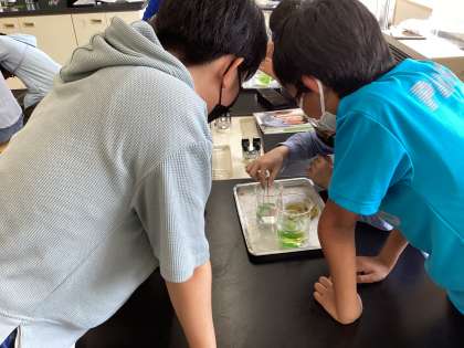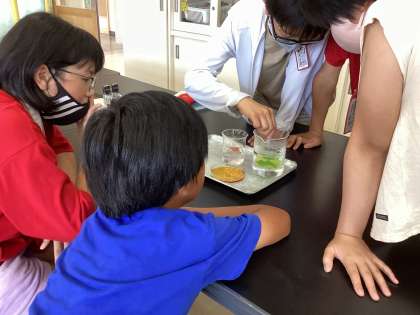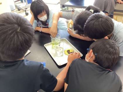 エタノールを使って葉の色を抜き、ヨウ素液にひたして確かめました。子どもたちは、いろいろな実験を行う中で、新しい発見をしています。
