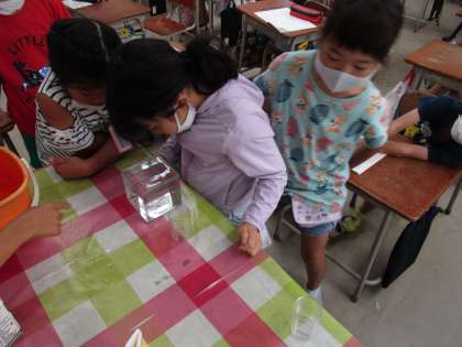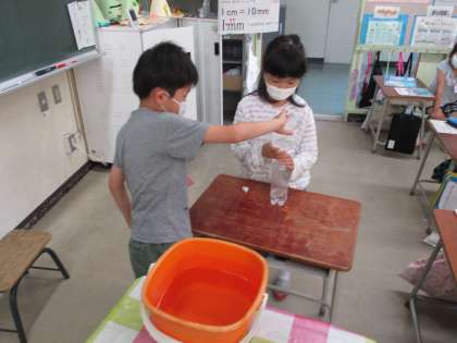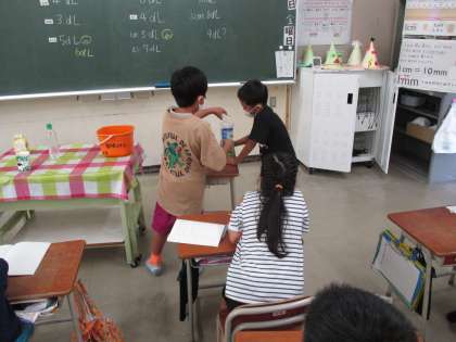 算数科では水のかさの勉強をしています。飲み物の容器に何dL入るかを調べました。予想を確かめる中で水のかさの量感を身につけていました。