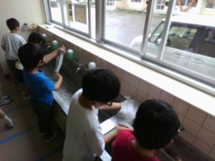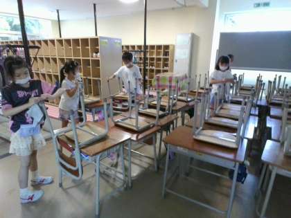 1学期の最後に、大掃除をしました。机を廊下に出し、水拭きをしました。また、玄関で下駄箱を拭いたり、椅子の足を拭いたりもしました。ぴかぴかになった教室は、とても広く感じ、子供たちも嬉しそうでした。