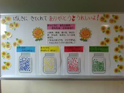 1年生の元気な声が、学校に戻ってきました。2学期が始まった今の気持ちを、玄関のホワイトボードに表現してもらいました。「2学期が楽しみだよ(青)」、「暑いけど、がんばってきたよ(黄色)」、「友達に会えてうれしいよ(赤)」、「もっと夏休みがほしかったな(緑)」の4つです。どのビンも、子供たちのシールでいっぱいです。