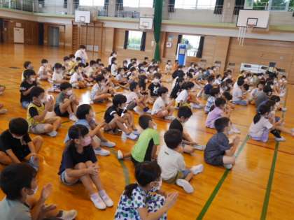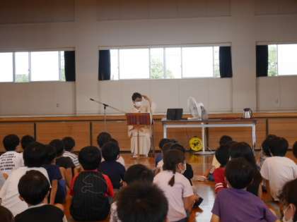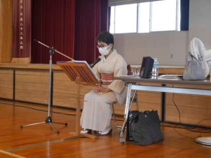 朗読家の鈴木優子先生をお招きして、朗読会を行いました。まずは1年生の教科書に出てくる「くじらぐも」を読んでいただきました。人物によって声ががらりと変わり、子供たちは一気にお話の世界へ引き込まれていきました。絵本や昔話などさまざまなジャンルのお話を聞き、笑ったり真剣に聞いたりと時間はあっという間に過ぎていきました。富山弁バージョンの「おおきなかぶ」は大盛り上がりで、なじみのある言葉で聞くとまたひと味違った面白さを感じました。