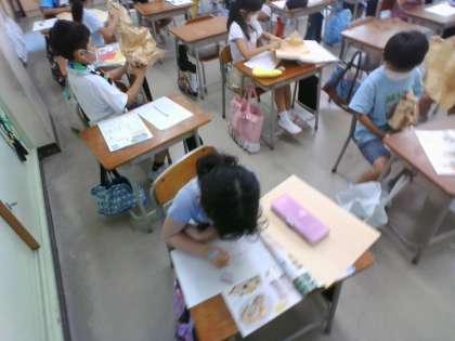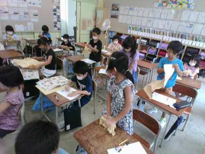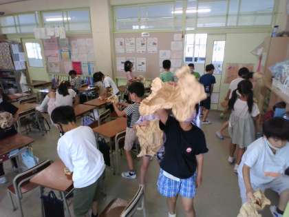 紙をくしゃくしゃにしています。どんな作品ができるのでしょうか。楽しみですね。