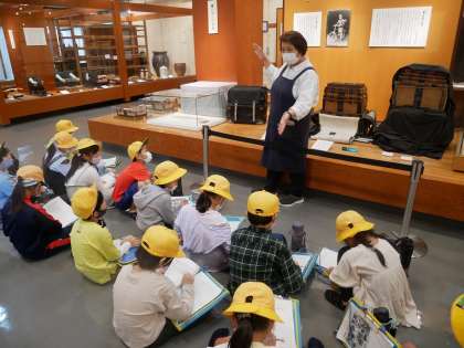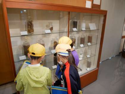 売薬資料館に行きました。富山は薬が有名であることを教えていただき、薬を作る道具や薬を包む袋など、薬にまつわるものについてたくさん見学をしました。薬の種類を数えたり、薬の原料となる薬草にもたくさんの種類があることを知ったり、富山の薬について学びました。