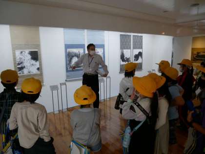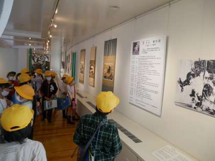 篁牛人記念美術館に行きました。篁牛人さんが描かれた水墨画について教えていただき、普段書写で使っている墨で絵が描けることに子供たちは驚いていました。