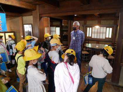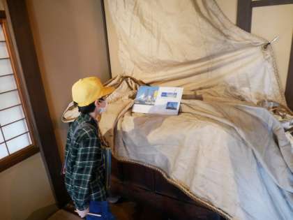 民芸館に行きました。昔のおもちゃや凧、うちわ、帆船の帆を見学しました。館長さんや学芸員さんのお話を聞いて、昔の道具のしくみやつくりについて教えていただきました。