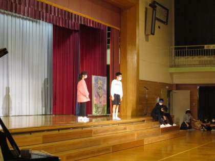 今日は、2年生と4年生、そして校長先生に劇を見ていただきました。見ている人に思いを伝えようと、台詞や動き、表情に気持ちをこめて演技をしました。人に見てもらうのは初めてで、子供たちは緊張しながらも一生懸命自分の役を演じていました。残り二日間で、いただいたアドバイスをいかしながら、まだまだ完成度を高めていきます。