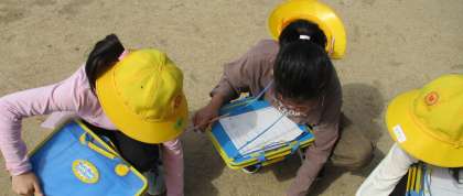 理科では、日向と日陰で地面の温かさや湿り気がどのように違うのかを確かめるために、グラウンドで実際に手を地面に当てて、確かめました。「日向は温かいけど、日陰は少しひんやりするよ」「もしかしたら、気温や天気も関係するのかもしれないね」と子供たちは気づいたり、考えたりしたことを呟いていました。