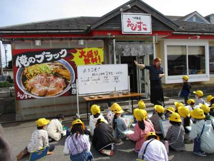次は、えびすこさんでの様子です。ラーメンを作る道具を見せていただいたり、ラーメンとつけ麺の麺の違いなどを教えていただいたりきました。