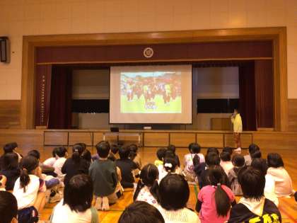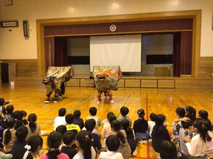 総合的な学習の時間にゲストティーチャーとして、赤田ししまい保存会さんに来ていただきました。赤田ししまいが始まったきっかけ、ししまいの種類などたくさんのことを教えていただき、実際にししまいを披露していただきました。生で見るししまいの迫力に圧倒され、子供たちはししまいに見入っていました。