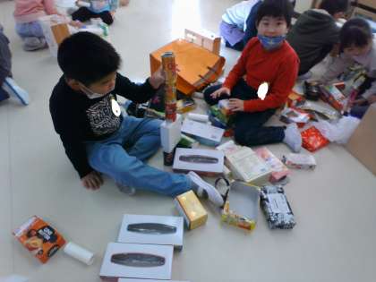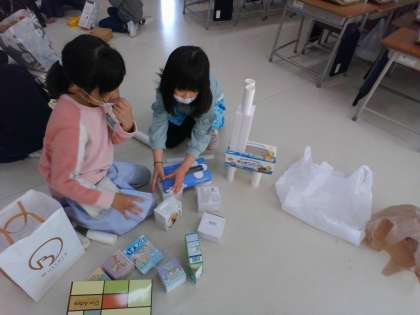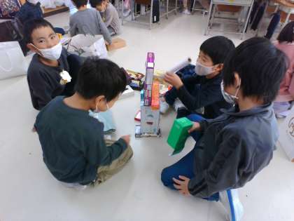 算数で、箱を使った学習が始まりました。最初は、持ち寄った箱を積んで、様々な形を作りました。ロボット、動物、お城、タワーなど、子供たちは楽しそうに活動していました。その中で、「この形は積みやすい」「平たくないと積めないね」「丸いと転がるね」など、様々な気づきが生まれていました。