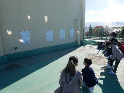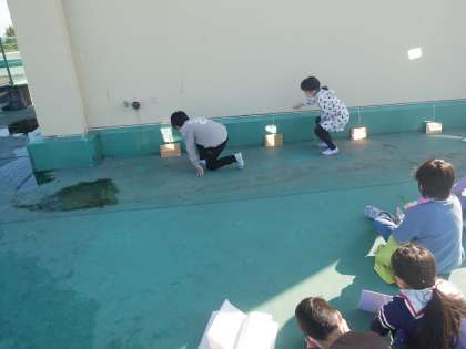 理科では太陽と日光について学習をしています。鏡で日光をはね返している様子です。的当てゲームや実験を行う中で、様々な疑問をもち、解決していきました。
