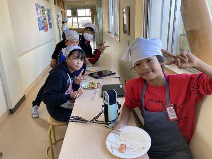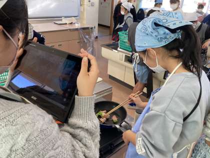 「主菜を作ろう」ということで、各自が考えたメニューを実際に作りました。調理実習にも慣れてきた子供たちは、手際よく作業を進めており、調理中だけではなく、準備や片付けをする姿もとても頼もしく見えました。