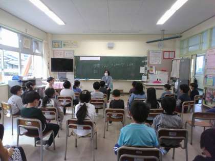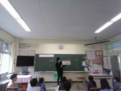 蜷川小学校から少し離れたところにある、富山市立図書館蜷川分館の図書館司書の方々に、読み聞かせに来ていただきました。