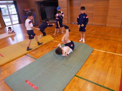 前転、後転等の基本的な技に加え、開脚前転、開脚後転、側方倒立回転等の発展的な技にも挑戦しています。自分のできる技を増やそうと、自分に合った練習を見付け、取り組んでいます。