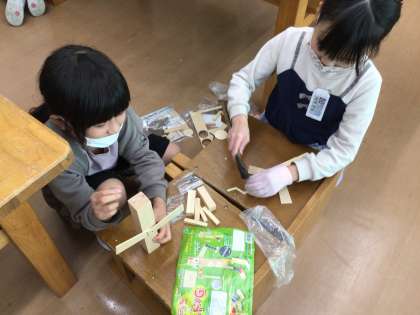 釘を使って木材に打ち込み、作品を作りました。初めて使う金づちに最初は苦戦しながらも、だんだん慣れてきて、友達と協力して作品を作りを楽しみました。