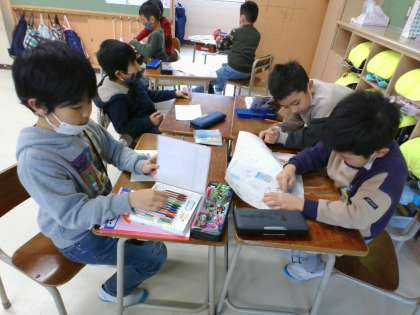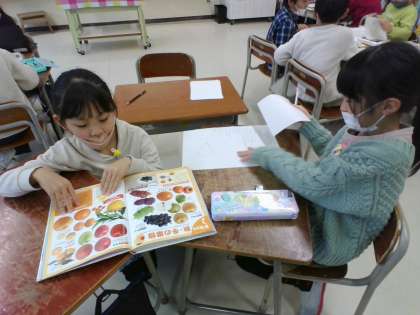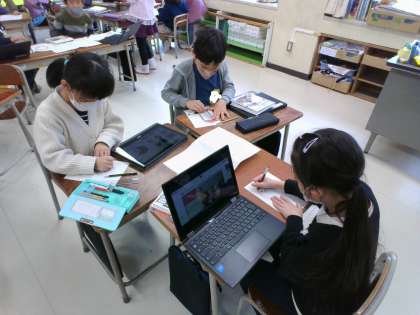 国語「ものの名まえ」で、お店ごっこの準備をしています。「くだもの」のお店では、異図鑑で果物を調べていました。「おもちゃ」のお店では、Googleでおもちゃの名前を検索していました。「おかし」のお店では、自分が知っているお菓子を出し合っていました。