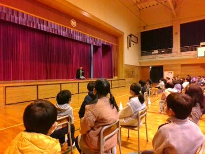 今日は、三遊亭良楽さんをお招きして、落語を見ました。子供たちは、巧みな話術に引き込まれ、大笑いしていました。教室に戻ってからも「すごく楽しかった」「また良楽さんに会いたい」と、落語の楽しさに目覚めていました。