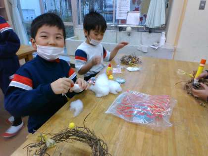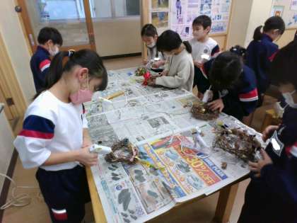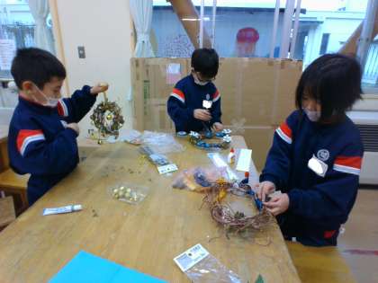 子供たちが育てたアサガオのつるを使って、クリスマスリースを作りました。グルーガンで飾りをつけたり、ボンドでリボンを貼ったりと、みんな素敵なリースを仕上げていました。