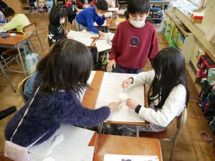 理科では重さの学習を行いました。算数科でも学習したことを生かしながら、粘土や紙等の形を変えても重さは変わらないこと、体積が同じでも重さが違うものがあることを実験を通して学習しました。