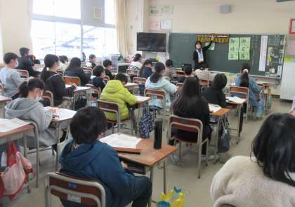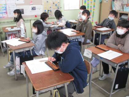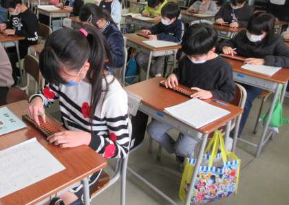 算数の学習で、日本珠算連盟の先生方から、そろばんを使って計算する方法を教えていただきました。先生方に丁寧に教えていただき、たし算や引き算がそろばんを使ってスムーズにできるようになりました。最後に、読み上げ算をしたときには、「できました」「できました」とたくさんの子供たちが嬉しそうに手を挙げていました。