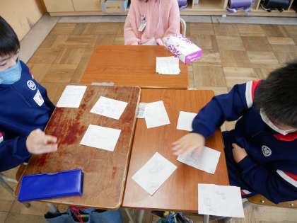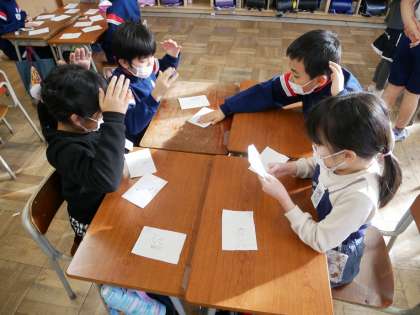 国語では漢字の音訓を使ってかるたを作り、読み札を読んでだり、取り札を取ったり、漢字の音訓に楽しみながら親しみました。