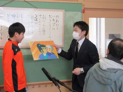 2月3日にチューリップテレビの毛田アナウンサーが蜷川小学校に取材に来られ、児童にインタビューをしたり、授業の様子を撮影したりしていかれました。