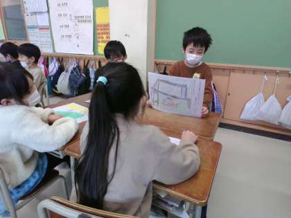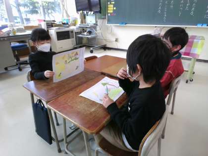 お話の中の好きな文を選んで写し、絵を書いて、友達に発表しました。