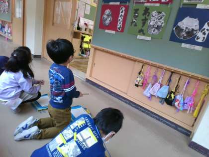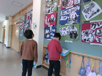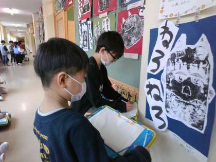 「鬼の目が大きくなっていて、にらまれているみたいです」「鬼と文字がぴったりだなって思います」など、感じたことを伝え合ったり、メモしたりしていました。