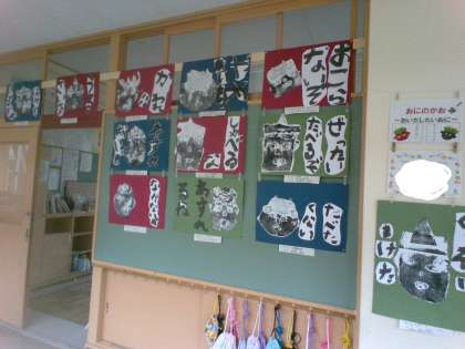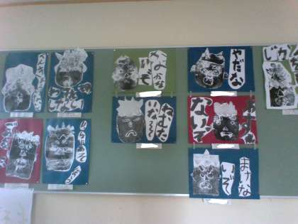 自分の中にある追い出したい鬼をテーマに、版画を作製しました。仕上がった作品を見ると、どれも個性あふれる作品になりました。「泣かないぞ〜」「わすれるな」と自分自身に言い聞かせているようです。