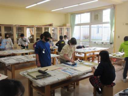 4年生は、両面版画に挑戦中です。彫刻刀を使って、板の片面に動物や生き物を、反対の面に背景を彫りました。今週は、背景側を刷りました。自分の作品に合わせて、インクの色を選んでいます。
